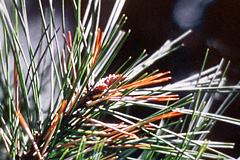 | 状態 | マツの葉が短くなったり、くの字状に曲がる。  葉と葉が途中でくっつき、その部分が茶色になって少し膨らむ。膨らんだ部分の中には数mmの黄色の幼虫がいる。  |