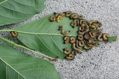 | 状態 | 葉縁から食害される(写真1)。食害は隣接する葉から葉へと連続的に発生する。幼虫や幼虫の脱皮殻が見られる(写真1~3)。被害部位の下に虫糞がある。秋から翌春までは被害木下の土中に繭がある。 糸、蛹、蛹の抜け殻はみられない。 |