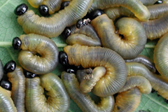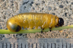 | 幼虫 | 体長最大約25mm。 黄色で背面は暗い灰色(写真1~3)。 頭部は黒色。 数十頭の集団を作る。  ハバチ科では腹部に体液の分泌腺はなく、胸脚の爪に付属物はない。 ハバチ亜目では眼(側単眼)は左右に各1個、脱皮殻は頭部から腹部までつながり、頭部が縦中央で割れる。  |