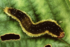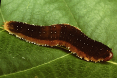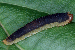 | 幼虫 | 体長最大19mm。頭部は褐色。胸腹部は背面が黒褐色で、白色または淡色の円錐形の小突起があり、側面から腹面が黄色から淡褐色(写真1~3)。頭部近くの背面に一対の大きな円錐形の突起があり、尾脚には円錐形の突起が4本ある。  ハバチ科の自由生活する種では、触角は4~5節、上唇には通常縦溝がない。体液の分泌腺はない。胸脚の爪に付属物はない。 ハバチ亜目では眼(側単眼)は左右に各1個、脱皮殻は頭部から腹部までつながり、頭部が縦中央で割れる。  |