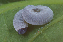| 状態 | 葉が食害される。 食害部位に幼虫や幼虫の脱皮殻が見られる(写真1~2)。 糸、蛹、蛹の抜け殻はみられない。 夏は被害木下の土中に幼虫がいる。明瞭な繭はない。 |
