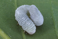 | 幼虫 | 体長最大約25mm。 頭部は黄褐色(若齢では暗灰色)。胸腹部は乳白色で、白いロウ物質に薄く覆われる(写真1~2)。なお、土中の幼虫はロウ物質に覆われないと思われるが、未確認。 胸脚は黄褐色。 腹脚は腹部第2~8節と10節とに計8対ある。 単独性または数頭の集団を作る。  ハバチ科の自由生活する種では、触角は4~5節、上唇には通常縦溝がない。体液の分泌腺はない。胸脚の爪に付属物はない。 ハバチ亜目では眼(側単眼)は左右に各1個、脱皮殻は頭部から腹部までつながり、頭部が縦中央で割れる。  |