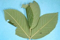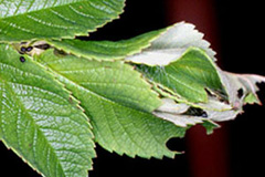 | 状態 | 糸で葉が巻かれたり綴り合わされ、縁から食べられる(写真1~2)。 食害部位に幼虫や幼虫の脱皮殻がみられる(写真3)。 蛹や蛹殻はない。  夏から翌春までは被害木下の土中に幼虫や前蛹がいる。 繭は作らない。  |