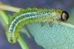 写真1 終齢幼虫、体長17mm。美唄、バラ属、2004/8/2。 |