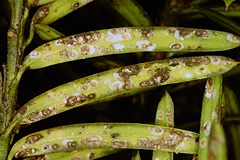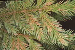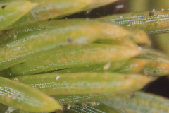 トドマツノハダニ トドマツノハダニ 春から夏に葉がスプレー状に黄色から茶色になる。高倍率のルーペで観察すると微細な糸、点状の黒い糞、ごく微小な(体長約0.4mm)ダニがみられる。