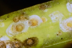 ヒノキマルカイガラムシ 円形~楕円形の貝殻状、最大径1.5mm。黄色。葉に寄生。サワラで多発することがある。