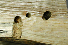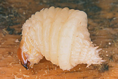 オオゾウムシ オオゾウムシ 丸太や伐根に円形の穴が開き、粗い木屑が出る。直径は5~10mm。穴は材内に続き、幼虫がいる。 幼虫に脚はない。