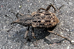 クワヒョウタンゾウムシ クワヒョウタンゾウムシ 幼虫は体長最大約10mm、キンケクチブトゾウムシに似るが、腹部の毛の配列で区別できるようである。成虫は体長約7mm、黒色だが、灰色の毛に広く覆われる。