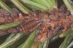 被害  ヨーロッパではトウヒ属の重要害虫(特にクリスマスツリーの)とされ、多発すると煤病を併発、葉が黄変したり、新梢が湾曲するといわれている。
