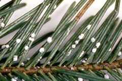| 状態 | トドマツの葉表に黄色の斑点ができ、葉裏に黒点状のものまたは小さな白い綿状のものが付着する。  春にアカエゾマツやエゾマツなどトウヒ属の枝に高さ2cmほどの赤から緑の松ぼっくりに似たこぶができる。古いこぶは茶色で穴が開く。  |