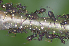 トビイロケアリ・クロクサアリ・アカヤマアリなどが共生するが、土莢(どきょう、土などによるアブラムシの隠れ家)は作らない。