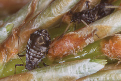 生態 春から秋に若い木の枝に寄生;アリが集まる;秋に針葉の上側に2~10卵を並べて産む(文献1970)。
