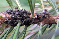 防除 激しい被害は記録がないため、商品として栽培する場合を除き、防除は必要ないと考えられる。防除にはマツまたは樹木のアブラムシ用に登録されている農薬を散布する。アリと共生するので、アリを駆除する(文献1994b)。