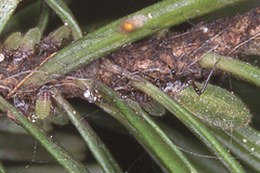 写真1 幼虫と成虫、体長最大3.5mm。美唄、トドマツ。2002/5/17。  |