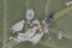 | 昆虫 | 体長最大約4mm。体は黄褐色で、濃緑色の横縞がある、あるいは白い綿状の物質でおおわれる。雌成虫の一部はやや曇った翅を持つ。 |