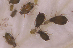 | 状態 | 葉が黒ずんだり、新梢が縮れる。アブラムシが群棲する。アブラムシは体長最大2mm。体は黄色、緑色、青緑色、黒色など変異が大きい。 |