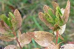 写真1 被害葉。白滝、エゾムラサキツツジ。2008/9/12。  |