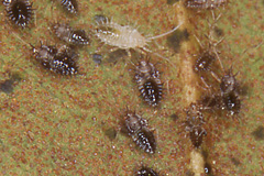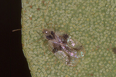 | 状態 | 葉がスプレー状に白や黄色になる。葉裏には黒い糞が点々と付着し、たいてい微小な昆虫(最大長約4mm)がみられる。幼虫は黒くトゲが生える。成虫は半透明、茶色の模様がある。 |