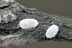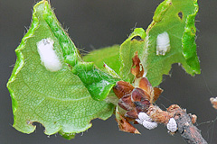 生態 幼虫が2mmほどのときに枝で越冬する。春に若い枝に移動し吸汁加害する。成虫は葉裏に白い綿状の卵の塊を産む。