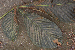 写真1 トチノキの被害葉。中川町、2000/8/24。 |