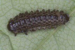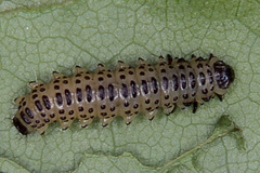 | 幼虫 | 体長最大10mm。黄土色の地に黒い斑紋がある、あるいは全体的に黒い。体の前方下側に3対のくの字状の脚(胸脚)がある。尾端は吸盤状。腹部に脚はない。 |