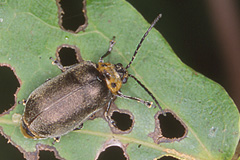 生態 年1回発生。卵越冬。幼虫は5月に孵化し、葉を食べて成長する。6~7月に幼虫は地上に降りて土中に潜って蛹になる。成虫は8~9月に出現し、葉を食害する。雌成虫は卵は樹皮の割れ目などに産み付ける。