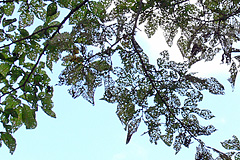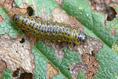| 状態 | 葉が食べられる。幼虫や成虫がいる。幼虫は体長最大約10mm、黄色で黒い斑紋がある。成虫は体長約10mm、鞘翅は赤色、他は黒色で青色の光沢がある。成虫は体長7mm前後。 |