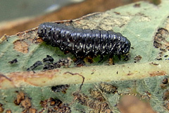 | 状態 | 葉が変色し、網目状になる。幼虫や成虫がいる。幼虫は体長最大6mm。尾端は吸盤状。腹脚はない。成虫は体長4mm、青色に輝く。 |