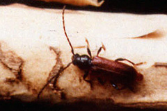 被害と防除  10~30年生くらいの衰弱木の幹や太い枝、損傷木が被害を受けやすい;寄生された枝や梢頭部は枯死し、ついには樹全体の枯死を招くことがある(文献1943)。健全な生立木は加害しない;春~初夏に伐倒木を樹皮つきのまま放置すると樹皮下が加害される(文献1994)。