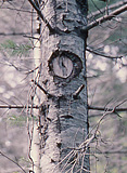 写真3 穿孔跡(樹皮をはがしたところ)。  |