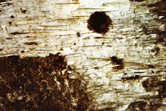 写真1 被害孔(たぶんゴマダラカミキリ被害木)。美唄、シラカンバ、2001/6。  |