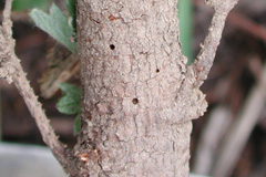 | 状態 | 枝や幹に穴が開く。穴は円形、直径約1mm。 穴から粉状の木くずやヤニがでる。 樹皮下に小さな甲虫や幼虫がいる。 |