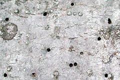 写真1 被害木樹皮に開いた脱出孔。豊頃、トドマツ。2004/6/16。  |