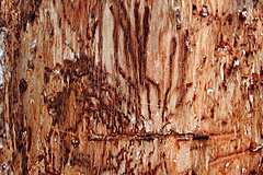 | 状態 | 木が枯れる。 幹や枝の樹皮に穴が開く。穴は円形、直径約2mm。 穴から粉状の木くずややにがでる。  樹皮下に甲虫・幼虫・蛹がいる。また、幅2mm長さ最大30mmのトンネル(母孔)が水平方向に延び、母孔の左右から先端に向かい太くなるトンネル(幼虫孔)が多数ある。幼虫孔は木くずが詰まる。  |