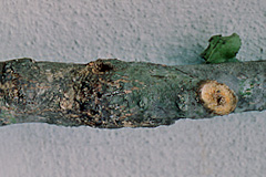 | 状態 | 直径5mmほどの穴が開き、木くずが出る。樹皮を剥がすと幼虫がいる。  材内の幼虫のトンネルの断面は円形、直径4~6㎜。  |