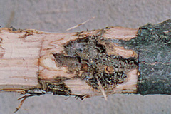 写真2 被害木、写真1の樹皮をはがしたところ。  |