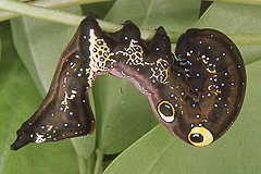アケビコノハ アケビコノハ 体長最大約75mm。体は黒色、茶色、または緑色。背中に2対の目玉模様がある。6~7月に出現。