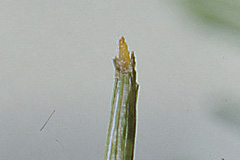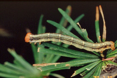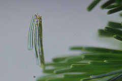 トドマツアミメヒメハマキ トドマツアミメヒメハマキ 体長最大約12mm。体はやや太く、淡い黄色。頭部は黄色。春に新葉を糸でつづりあわせ、その内側から葉の片面だけを食べる。