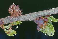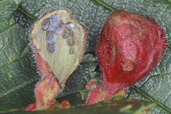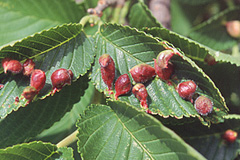 オカボノクロアブラムシなど オカボノクロアブラムシなど 6月、ニレの葉に長さ約7~8mmの赤いコブができる。夏以降、コブは茶色に枯れる。