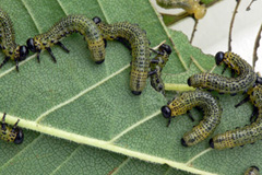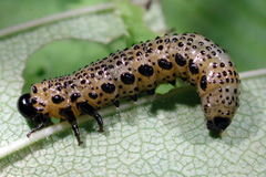 ニレチュウレンジ ニレチュウレンジ 体長最大約23mm。頭部と胸脚は黒色。胸腹部は乳白色から黄色で、多数の黒斑がある。集団性。7~9月に出現。