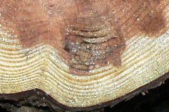 ヒノキカワモグリガ 樹皮から糞の混じったヤニがでる。樹皮下に淡い赤色または黄白色の幼虫がいる。体長最大約12mm。