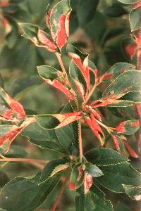 | 症状 | 葉裏の一部に紅色のビロードを張り付けたような外観を示す。罹病葉は上面にカールするため,葉裏の紅色がよくめだつ。 | ![]() サラサドウダンビロード病  |