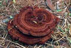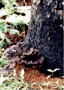 | 根株の心材が侵されるが,被害がひどいと地上高数mにまで腐朽が及ぶことがある。 暗褐色で海綿質の子実体が夏~秋にかけて地際または幹に近い地上に発生。 大きいものでは直径が20~30cmある。  | ![]() カイメンタケの発生したグイマツ ![]() カイメンタケ  |