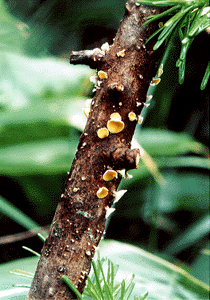 | 幼齢造林地に発生。樹勢の衰えや樹体の損傷が誘因となり発生する。幹が陥没し時に樹脂が漏出する。 病斑が幹を一周すると上部は枯死にいたる。 病患部には子のう盤が形成され,湿気によって開き,鮮やかな黄色を呈する。 径は大きいもので5mm程度で,小さなキノコ状。 トドマツオオアブラムシの寄生が原因で発生することもある。  | ![]() トドマツがんしゅ病  |