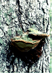 | 幹の心材部を侵す。枝の折れ口や枯枝から子実体(キノコ)が発生していることが多く,このような部位から侵入すると考えられている。 子実体が発生しないと,外見からの診断は難しい。 今のところ人工林(最高で70年生程度)では,子実体の発生を確認していない。 その他の幹心腐病菌 エゾサルノコシカケ・エブリコ・ツガサルノコシカケ キチリメンタケ・マツノウロコタケ・チラロコタケモドキ エゾタケ  | ![]() マツノカタワタケ  |