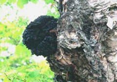 | カバノアナタケ 立木の幹に塊状で大型の菌核(径10~20cm)を形成する。 菌核の表面は黒く縦横に亀裂が走り,石炭状で堅い。内部は黄褐色。子実体(キノコ)は茶褐色で,樹皮下に平たく広がり,全面に小さな穴(管孔)が並ぶ。 心材が白く腐る。 その他の幹心腐病菌 ツリガネタケ・キコブタケ・ヒイロタケ  | ![]() カバノアナタケ ![]()  |