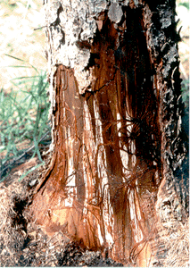| 幼齢林地に多い。根~地際が侵されるため,針葉全体が赤く枯れ,枯死にいたる。 病患部ではヤニの漏出が見られる。根・幹の樹皮を剥ぐと白い菌糸膜がみられるほか,病状が進んだものでは黒色ひも状の菌糸の束(根状菌糸束)も認められる。 根が傷ついたり滞水等で弱った場合にかかりやすい。被害木を放置すると根状菌糸束の接触感染により被害が広がる。  | ![]() 病菌に侵されたカラマツ ![]() 発生したキノコ(ボリボリ)  |