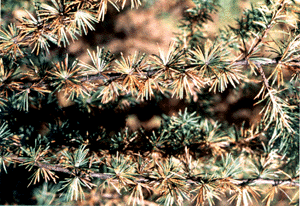 | 8月頃から輪生葉の先端または中央部に赤褐色の病斑ができ,徐々に拡大する。病斑は葉1枚に5~7個で,後にこの部分に微細な黒点状の菌体が数個から10数個生じる。 罹病した針葉が9月中頃までに落葉してしまうため, 成長量の減退を招く。霧が多発したり,5~7月に雨が多い場所で被害が目立つ。リン,カリ欠乏土壌も発生を助長する。  | ![]() カラマツ落葉病  |