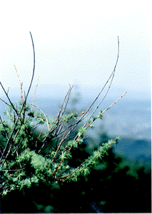 | 当年生枝や新梢が侵されて枯れる。枯枝では漏出したヤニの塊がみられる場合が多い。 7月過ぎになると黒い菌体が枝・幹の鱗片の隙間に現れる。まだ新梢が柔らかい6~7月に感染が起こると枯れた新梢はうなだれる。 連年繰り返されると,ほうき状の梢端を呈するようになる。強風によってできた傷から感染する。  | ![]() カラマツ先枯病  |