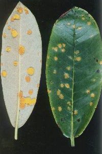 | 症状 | 秋,当年葉の葉表に不鮮明な淡橙色小円斑が多数形成される。翌年夏には,明瞭な橙色斑となり,斑点部の葉裏には,虫の卵の集団のようにみえる半球状,オレンジ色の固まり(冬胞子堆とよばれる菌体)が形成される。のち,この固まりは脱落して褐色の小さなくぼみが残る。病斑部は褐変するが,罹病葉全体が枯死することはない。 | ![]() ハクサンシャクナゲさび病  |